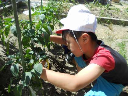 くすのき学級では,野菜を育てています。大きく実ったピーマンを見て,『もうとれるな』『まだこっちは小さいな』と言いながら嬉しそうにしていました。
