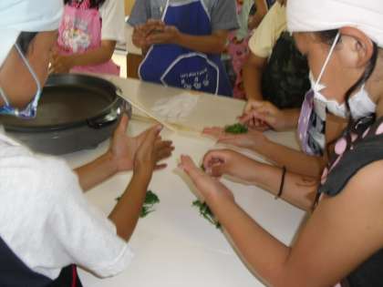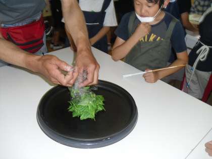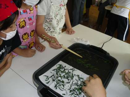 ホットプレートでお茶づくりをしました。これは,蒸製法と釜いり法の両方を取り入れた緑茶ができます。蒸す→揉む→乾燥→揉む→乾燥の順でお茶作り!