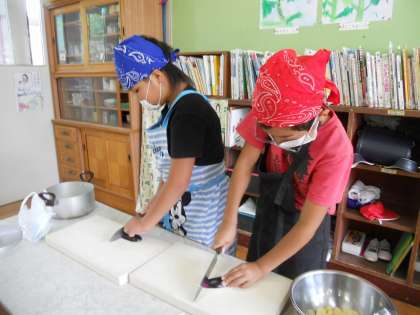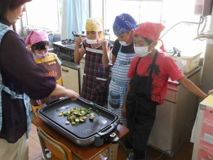 高学年は包丁を使って切ったり,ピーラーを使って皮をむいたりしました。低学年は調理ばさみを使ってピーマンを細かく切りました。トマトはつぶしてソースにしました。その後,炒めて塩コショウで味付けし食べました。どの子もおいしいと言っておかわりをしていました。