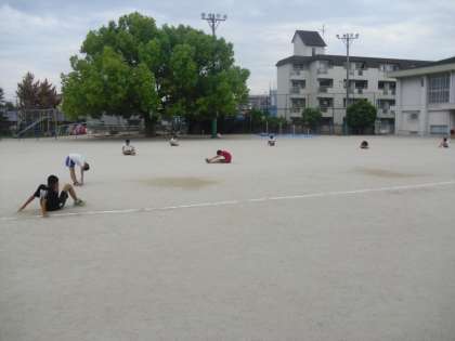陸上の練習を終え入念なストレッチに入ります。縮まった筋肉や腱を解し、伸ばして筋肉痛や故障を防ぎます。自分の身体は、自分で管理する。まさに無碍の境地です。