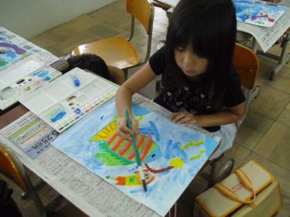 前回の図工の時間に描いた「ふしぎな海の生き物とあそぶわたし」の絵の仕上げをしました。