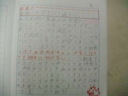 どんどんいろいろなことができるようになり,自信を付けてきています。ノートを見せてもらうと「家族の一員として自分のできることを考えて実行する。」,「家庭科で学習したことを生かして,休日には手料理をつくっています。」,「これからもお母さんを手伝っていきたいです。」,「中学校では,自分でお弁当が作れるようにしたいので,もっと上手になりたいです。」,「お父さんのシャツのボタンをつけてみたいです。」などたくさんのことが書かれていてうれしくなりました。