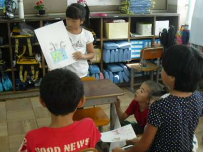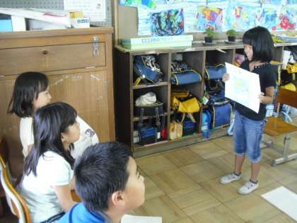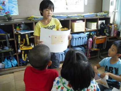 隣のクラスの友達に自分が考えたひみつ道具を発表しました。