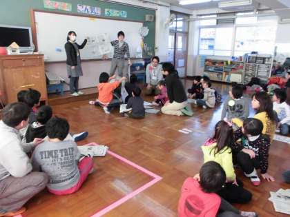 巨匠展のテーマを知るために絵本の読み聞かせを聞いたり,材料作りのために猫真似をしたり,キックをしたりして新聞紙をお友達と破ったりしました。