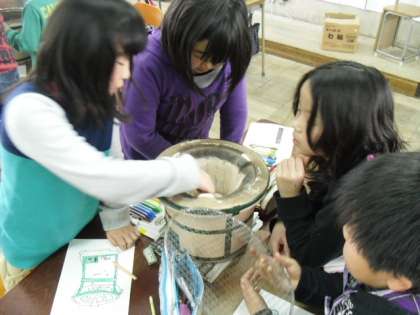七輪のふしぎ 公開日 2014/02/04 更新日 2014/02/04 3年生の部屋 明日は、学年行事です。 その前に・・・「七輪ってどんなの?」ということで、班ごとに七輪を触ったり、スケッチしたりしました。 炭を入れるところについて、「どこに入れるのかな?」「中に入っているのってふた?」 「ふたの上に炭をおくの?それとも下?」と班で話し合いました。 当日が、とても楽しみですね!