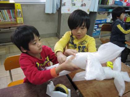 「すご〜い!傘袋とプチプチが人形に変身したよ!」