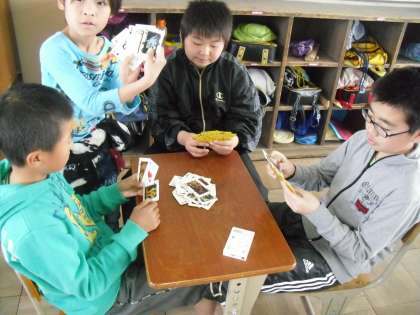 雨の日の遊び方を先日の高学年集会で確認したので,さっそくけん玉やトランプを持ってきている子がいました。