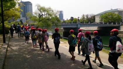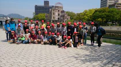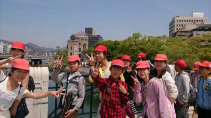 平和公園の中をみんなで歩いています。世界遺産の前で集合写真も撮りました。みんなで楽しい思い出をたくさん作ってもらいたいと思います。