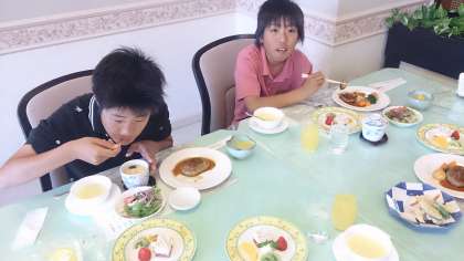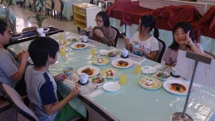 夕食の時間です。お料理はとてもおいしく、量も十分でした。笑顔で話しながら楽しくいただきました。
