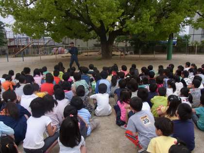 訓練が終わった後に、消防署の方からお話があり、けむりは上に行く方がスピードが速いことや、「お・は・し・も・て」の約束について教えていただきました。今日のように真剣に訓練に取り組み、自分の身を自分で守ることができるようにしていきたいですね。