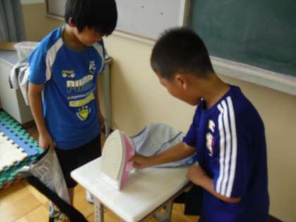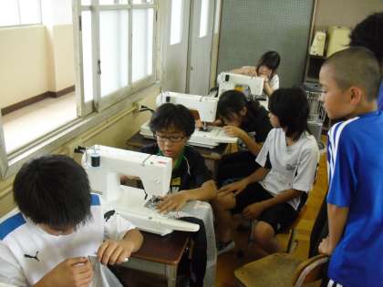 6年生では,家庭科の時間に「生活に役立つ物を作ろう」という学習でエプロン作りをしています。5年生でナップザック作りを経験している子どもたち、ミシンの取り扱いはお手の物です。みんな、しっかりアイロンがけもミシン縫いもできています。