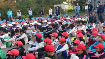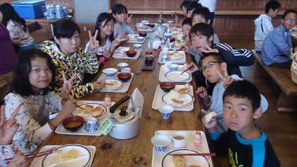山の家の2日目が始まりました。少し寒いですが、いい天気です。学校紹介も元気よくできました。朝食もみんなもりもり食べました。次は川遊びです。みんな元気いっぱいです。