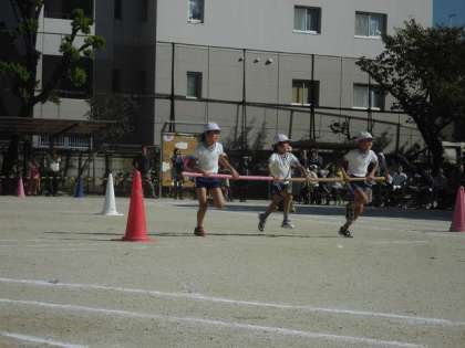 交流学級の友だちと心をあわせることで次の人に早く棒を渡すことができて