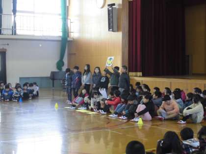 今日の2時間目は人権集会。4年生は今まで総合的な学習の時間で学んできた聴覚障害や国語の時間でも学んだ視覚障害のことについて発表しました。そして、児童会からは向島人権宣言を言ってもらいました。