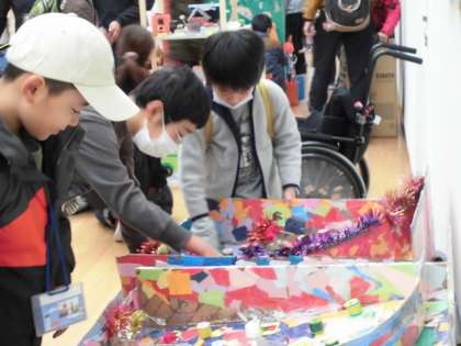 京都市美術館別館『小さな巨匠展』の見学に行ってきました。『ドリームシティ』の合同作品の前で写真をパチリ!その後高学年と低学年がそれぞれペアになって仲良く作品を鑑賞しました。他の学校が作った遊ぶことのできる合同作品で楽しんでいました。
