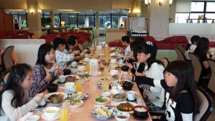 ホテルでの食事の様子です。とても豪華な夕食で,楽しくお話ししながら食べています。