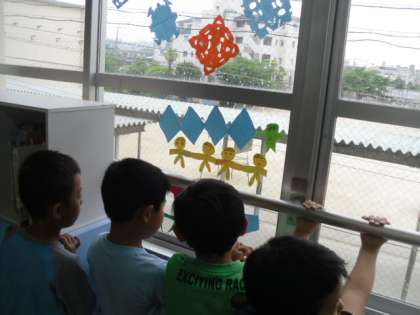 できたかざりは,教室に飾りました。さらに華やかな窓になりましたよ。