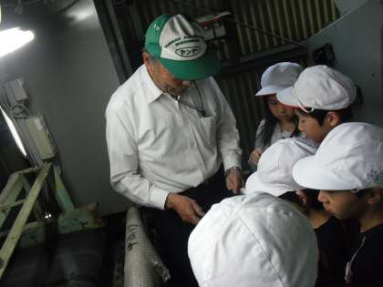 次に工場内の見学をさせていただきました。初めて見る工場内はとっても暑く温度は40度近くまで上がっていました。ただ、子どもたちは目を釘付けにして学習していました。