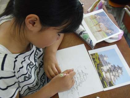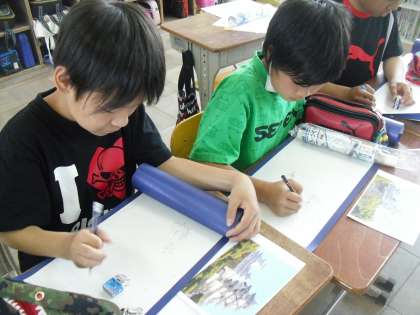 思い出の修学旅行の場面一つひとつを思い出しながら,絵を描き始めました。