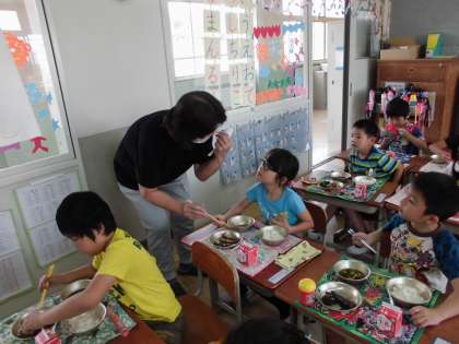 今日の給食の献立は,「さんまのかわり煮」でした。骨を自分で取れるかな・・・?ということで,給食時間にスペシャルゲストが来てくださいました。