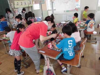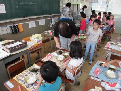 給食調理員の,加納さんと,古川さんです。みんなの机を回って、魚の骨の取り方を教えてくださいました。初めは,食べられるかな?と不安そうでしたが,食べてみると,「おいしい!」という声がたくさんあがりました。お家でも,魚を食べるときには,ぜひ,自分で骨取りに挑戦してみてください。