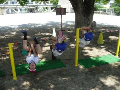 今日は鉄ぼう学習がありました。1組も2組も2回目の鉄ぼうだったので,少しずつ慣れてきたようです。組み合わせの技にも挑戦する子どもが多く,楽しく活動しました。