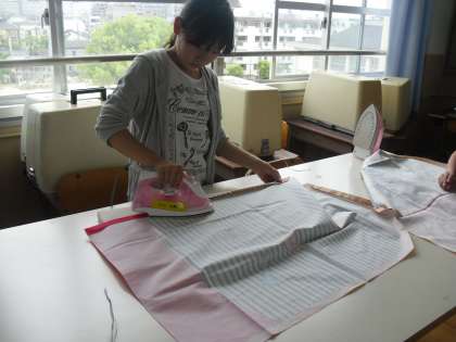今日は,布をエプロンの形に裁ち,アイロンをしてしっかり折り目をつけました。