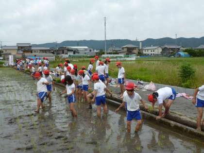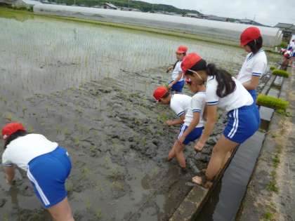 今日は地域の藤田さんにお世話になり,田植え体験をしました。