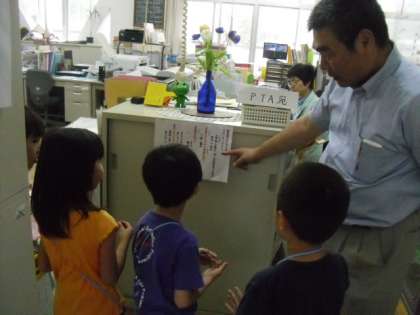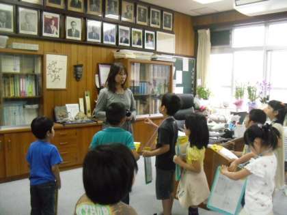 2年生が特別教室にいてくれ,教室の説明をしてくれたり,中を見せてくれたりしました。職員室や事務室,管理用務員室,校長室も先生が質問に答えてくださり,熱心に聞いていました。