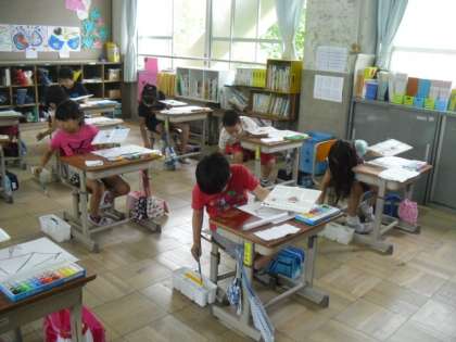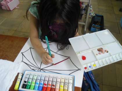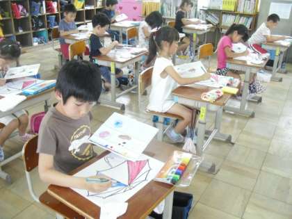 初めての絵の具! 公開日 2015/06/10 更新日 2015/06/10 2年生の部屋 10日(水)に,初めて絵の具を使った学習をしました。 子どもたちは早くやりたくて仕方ない様子でしたが 初めはきちんと覚えてほしいので 準備の仕方や,道具の名前などを ていねいに学習しました。 その後,おまちかねの絵の具を使って 色を塗ってみました。 ドキドキしながらも,なんとかていねいに塗ることができました。 みんなカラフルなかさになってきたね♪