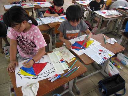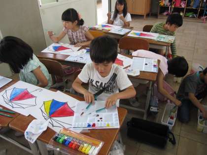 初めて絵の具を使いました。 公開日 2015/06/10 更新日 2015/06/10 2年生の部屋 本日(6月11日),初めて絵の具を使いました。 初めての絵の具では基本の色である,赤,黄,青の3色を使いました。 3色の色をそのまま使ったり,水で薄めてグラデーションにしたりしました。 みんなきれいなグラデーションの傘が描けました。 おうちにもって帰ったので是非『絵の具デビュー』した1枚をご覧ください。