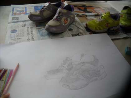 自分が履いているくつをよく観察して,描いていきます。形や模様だけでなく,ひもが通っている穴や縫い目など細かいところまで,しっかり観察していました。