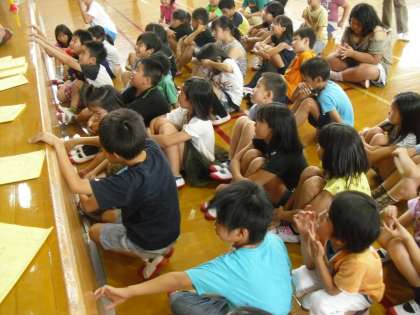 みさきの家の活動4 公開日 2015/06/16 更新日 2015/06/16 4年生の部屋 そして最後は西村先生の根性話!!子どもたちはどんどん西村先生の話に引き込まれていきます。「なぜ,みさきの家は三重県に作ったの?」などクイズ形式で子どもとお話しされました。中にはこわーいこわーいお話もあり,続きはみさきのナイトハイク前に行われるそうです。さぁ,続きを聞いた後にナイトハイク,いけるかな??