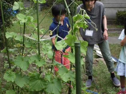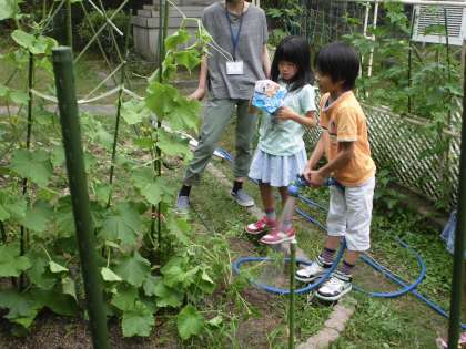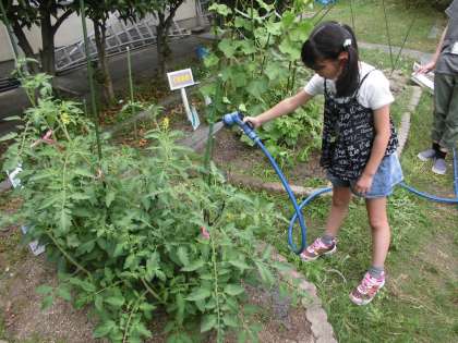 野菜がどんどん育っていきます 公開日 2015/06/16 更新日 2015/06/16 くすのきの部屋 新学期になって種や苗から育てていたキュウリやトマト、ナスなどが ぐんぐん成長しています。実が成り、収穫できた野菜もあるほど大きく育っています。 子ども達も日々大きくなる野菜にびっくり。もう少しで自分よりも大きくなるんじゃないかと思ったり。 二日間雨が降っていない土に向かってたくさん水をあげました。もっとたくさん収穫できたらくすのきのみんなで食べたいと思います。