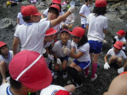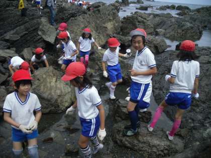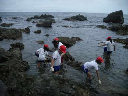 昼食の後、宮崎浜で磯観察をしました。なんと、タコが2ひきとウニなど、珍しい海の生き物が間近で観察できました。もちろん、最後は海にちゃんと返しました。