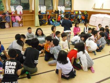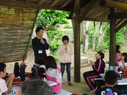 キャンプファイアーの時間まで時間ができたので、班の人と協力して、伝言ゲームをして楽しみました。