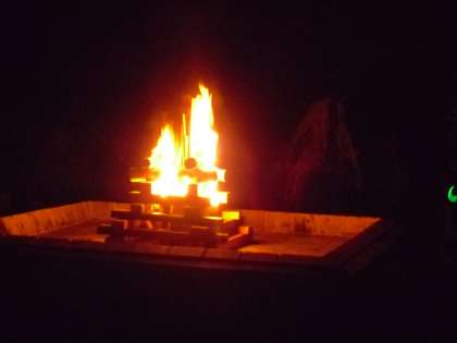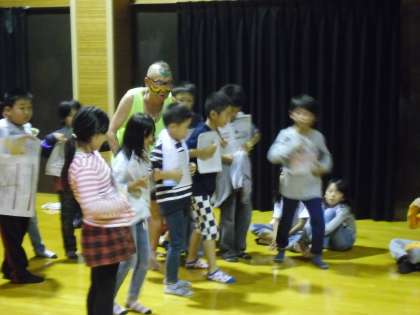 さあ、いよいよキャンプファイアーの時間になりました。レクリェーション係りの子供たちも今までの練習の成果を出そうと、はりきっていました。寸劇・楽しいゲーム・即興の教職員劇など、もりだくさんの内容でした。最後、マイムマイムと、校歌を歌ってしめくくりました。この後、反省会をして、バンガローで就寝します。