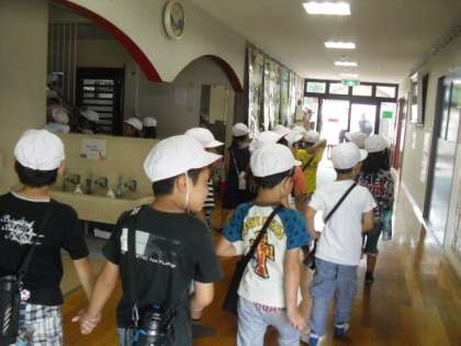 校区めぐりをしていると,向島保育園を見つけました。インターホンを鳴らすと,「どうぞー」との声が。中に入って,年長組のお友達と交流しました。