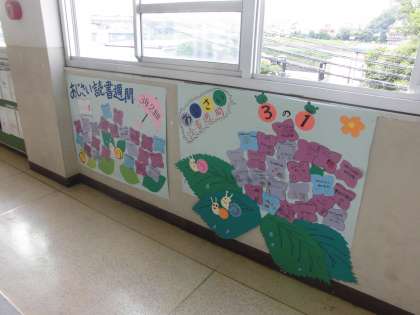 本に親しむ 公開日 2015/06/24 更新日 2015/06/24 3年生の部屋 6時間目は図書室で本に親しみました。多くの児童が新しい本を借りていました。3年生の廊下にもお勧めの本を書いた紫陽花が,きれいに花を咲かしています。これからもいい本にどんどん出会ってください。