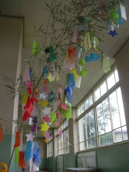 ★子どもたちが書いた短冊や七夕かざりは,廊下に飾ってあります。