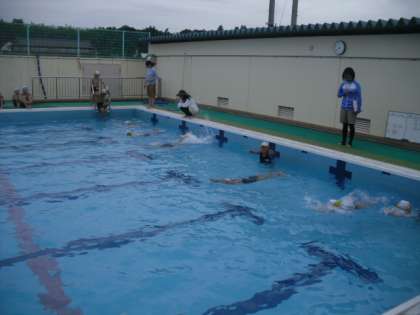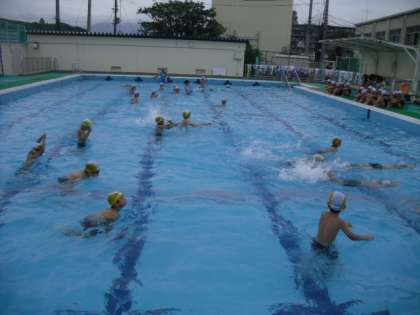 昨日のプールでの学習で,けのびや伏し浮きの練習をした後,どれだけ進めるか検定をしました。伏し浮きや,けのびをして足がついたところで,きょりを測ります。泳げる人は,どんな泳ぎ方でもよいので,息継ぎをしながら足がつくまで泳ぎます。