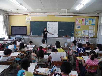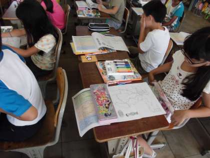 社会では「京都市の周りの様子」のまとめに入っています。白地図を色分けしながら,今まで学習したことを書いていきました。川や道路の位置から,地域の特徴が見えてくると理解が深まりました。