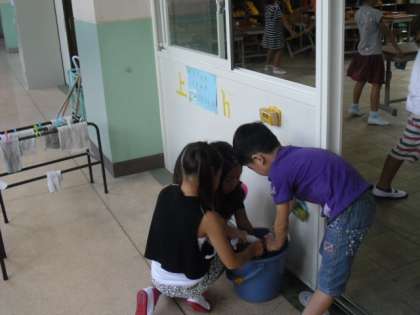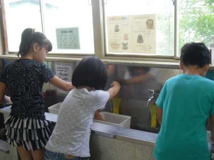 『先生,かさたてのかごを洗ってきてもいいですか?』