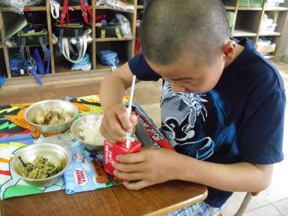 新しい牛乳のパックを楽しみにしていた子ども達。