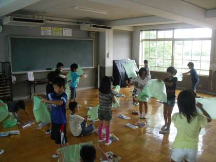 導入として,普段ではもちろん感じ取れない「空気の力」をゴミ袋を使って体験しました。