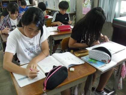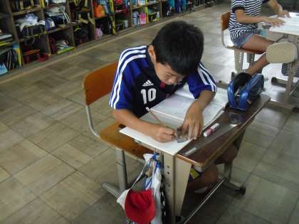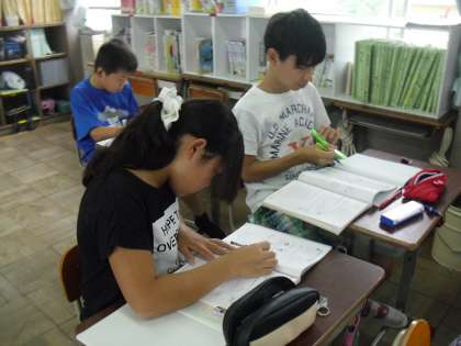 定規や色ペンを使って,見やすいノート作りをしている6年生です。