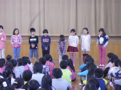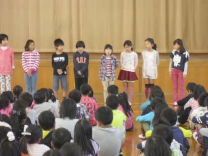 詩の発表の後に代表委員の決意表明がありました。3年生以上に代表委員がいるので,一番最後に決意表明をしました。しかし,ここでもしっかりと発表することができていました。後期も,学年のためにみんなをリードしてください。