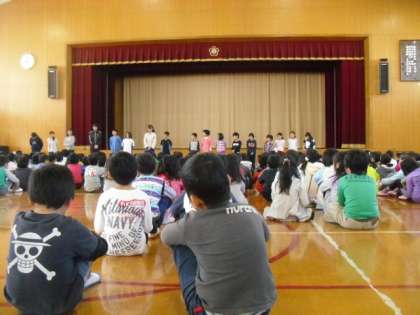 今日は,3年生の詩の発表と,くすのき学級の音読発表がありました。また,委員会のお兄さんお姉さんからのお知らせや,3年生以上のクラスの代表委員の紹介がありました。