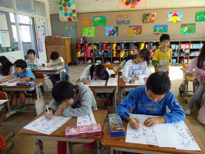 書写では、フェルトペンを使って書初めをしました。文字の形や大きさに気を付けて、ゆっくり丁寧に書きました。久しぶりに使うフェルトペンに戸惑ったり、いつもより大きな字を書かないといけないので難しかったりしましたが、みんな集中してかくことができました!