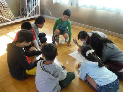 今日は,さっそく場面ごとに集まり子ども達が台本作り。